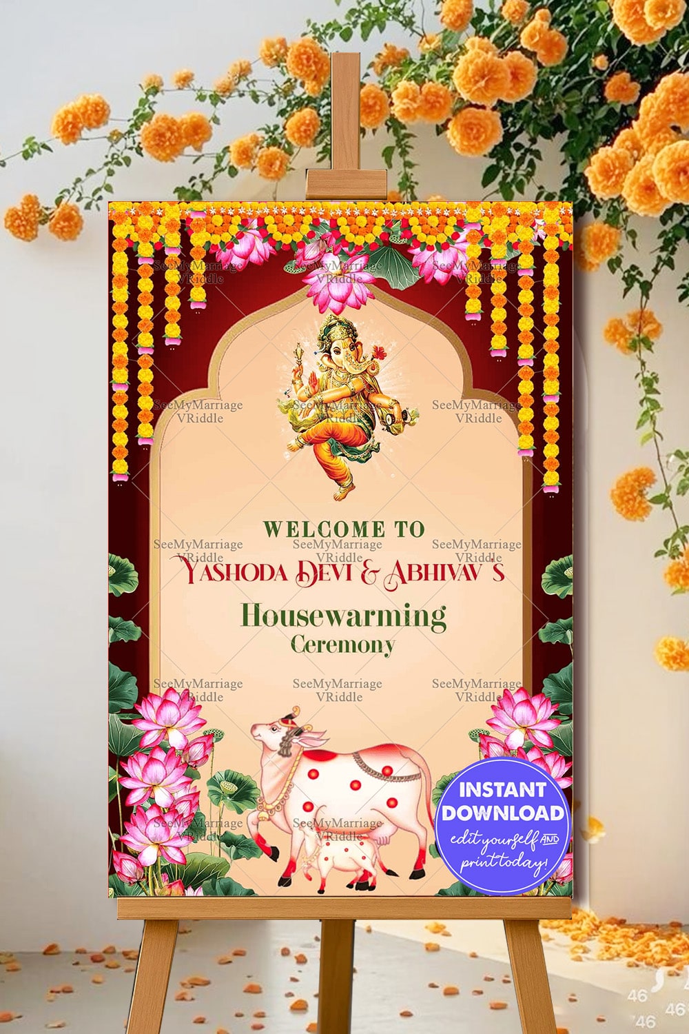 The Poster design beautifully incorporates traditional Indian elements for a housewarming ceremony. The central figure of Lord Ganesha, symbolizing prosperity and new beginnings, is artistically rendered, adding an auspicious touch. The background is adorned with vibrant marigold flowers and pink lotuses, which are significant in Indian culture for their purity and beauty. Floral garlands hang elegantly from the top, enhancing the festive feel of the Poster.