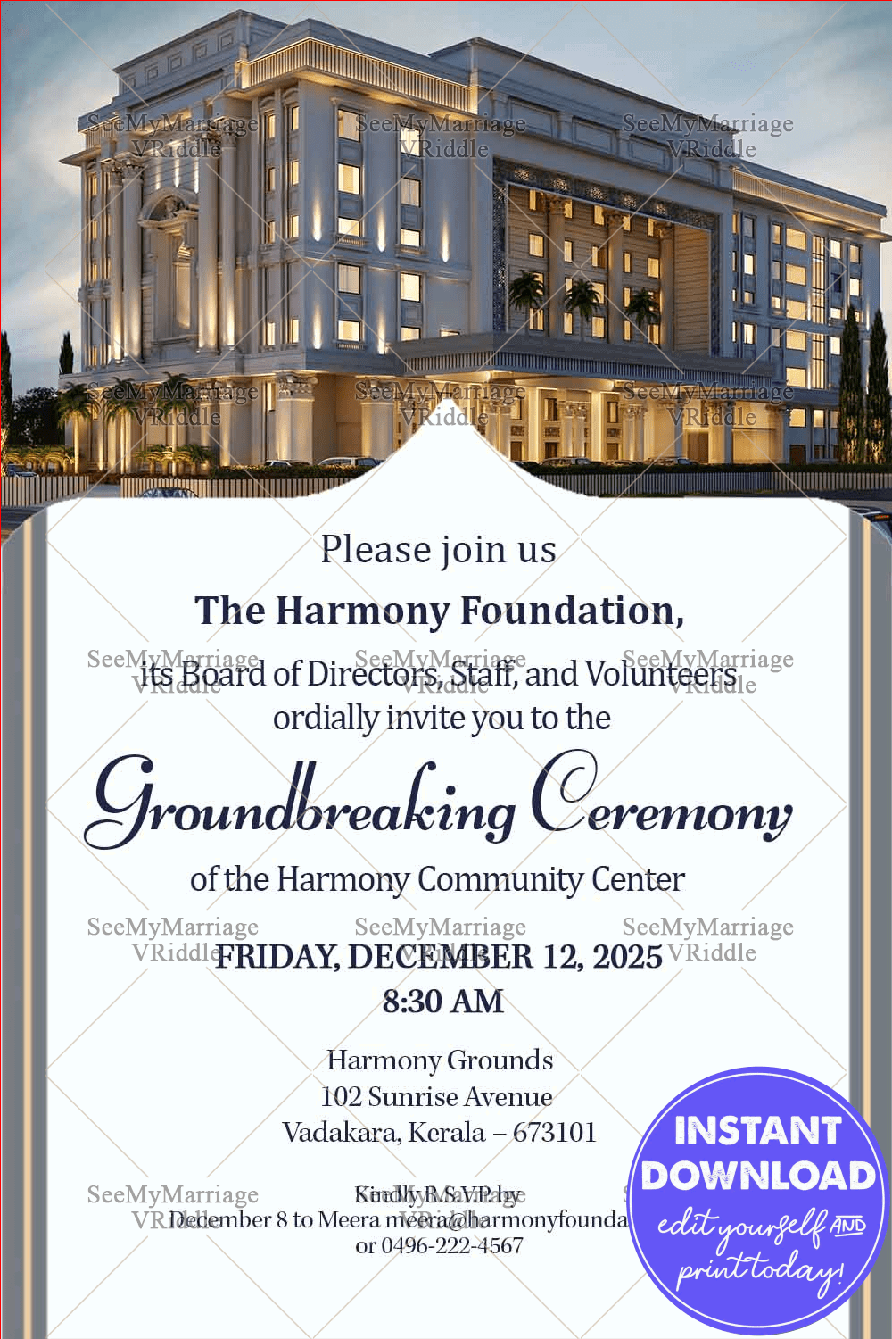 #GroundbreakingCeremony #CommunityBuilding #NewBeginnings #HarmonyFoundation #VadakaraEvents #ArchitecturalElegance #MilestoneMoment #CeremonyInvitation #ModernDesignCard #FutureIsNow