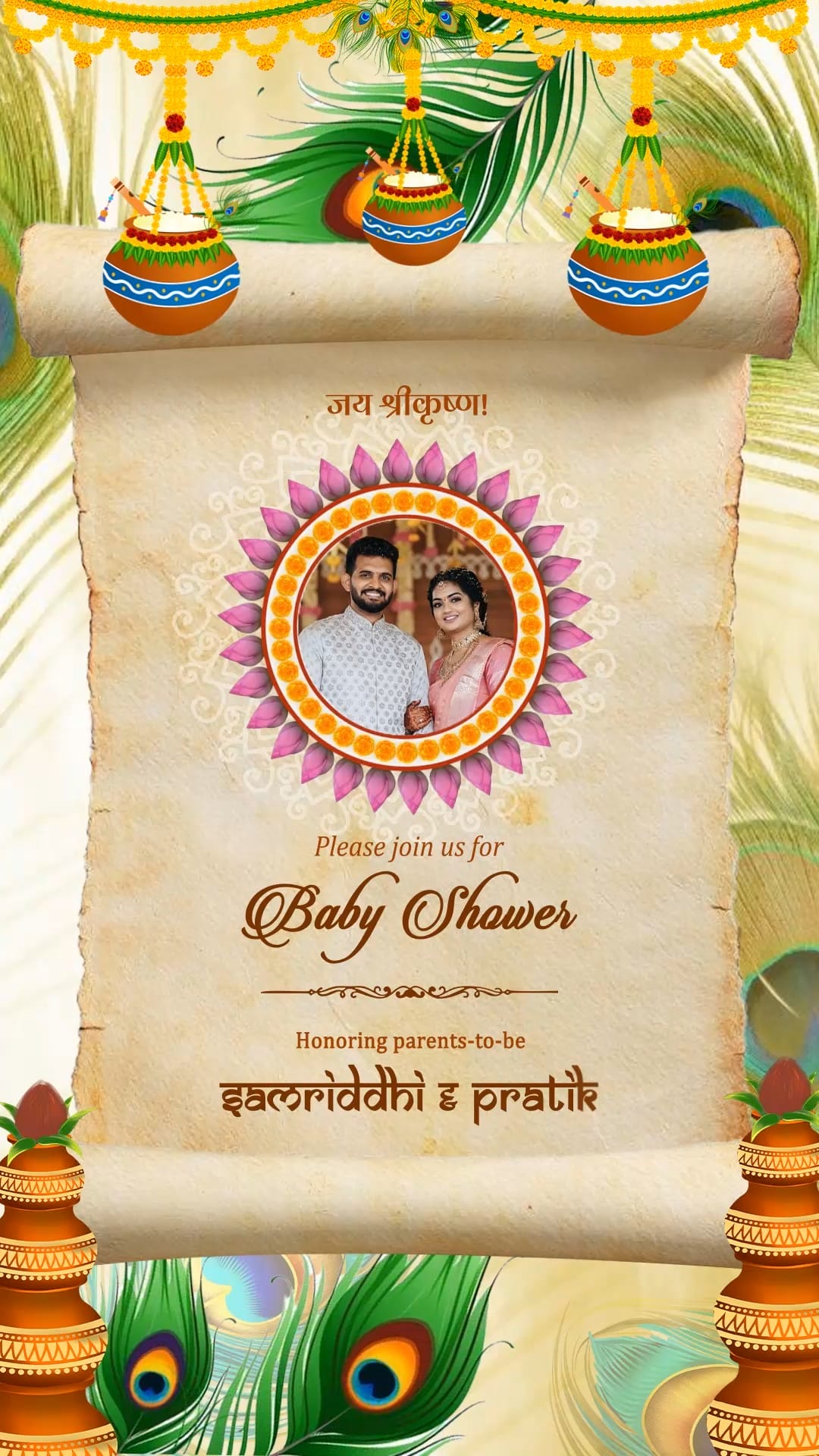 This beautifully crafted baby shower invitation blends vibrant tradition with devotional elegance. The scroll-style card is adorned with rich cultural motifs inspired by Lord Krishna, featuring hanging dahi handis, colorful garlands, and vibrant peacock feathers. The central highlight is a radiant lotus-petal mandala frame showcasing the glowing image of the soon-to-be parents, Samriddhi and Pratik, radiating joy and anticipation. The parchment background adds a rustic charm, while decorative kalash pots and vibrant peacock motifs complete the look with festive flair.